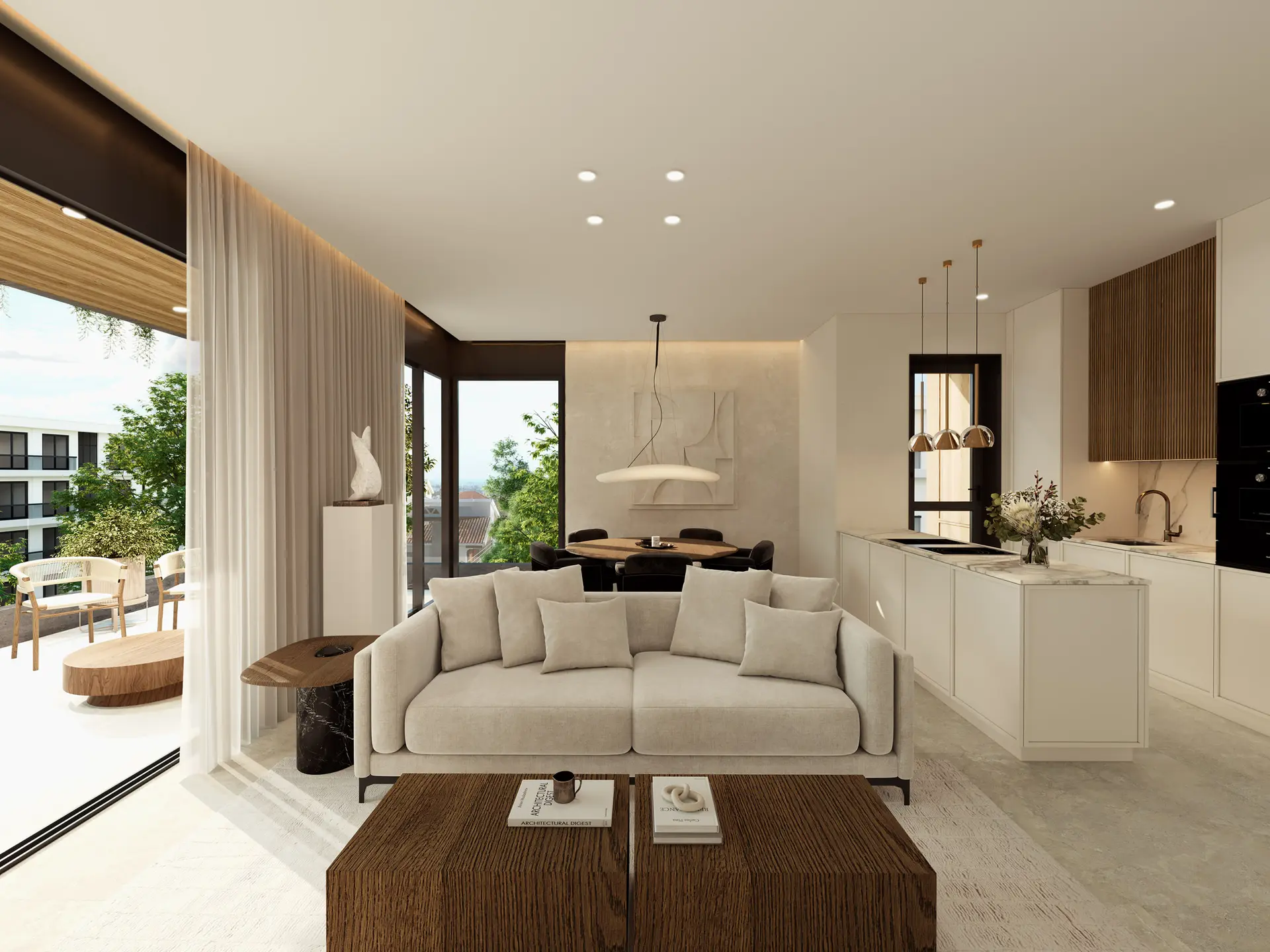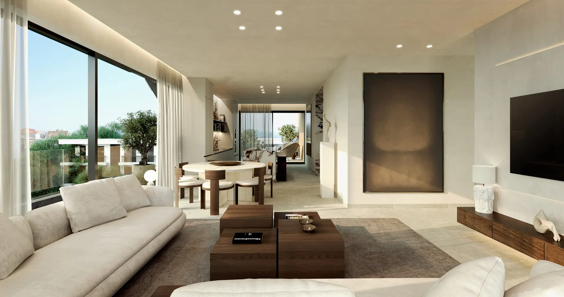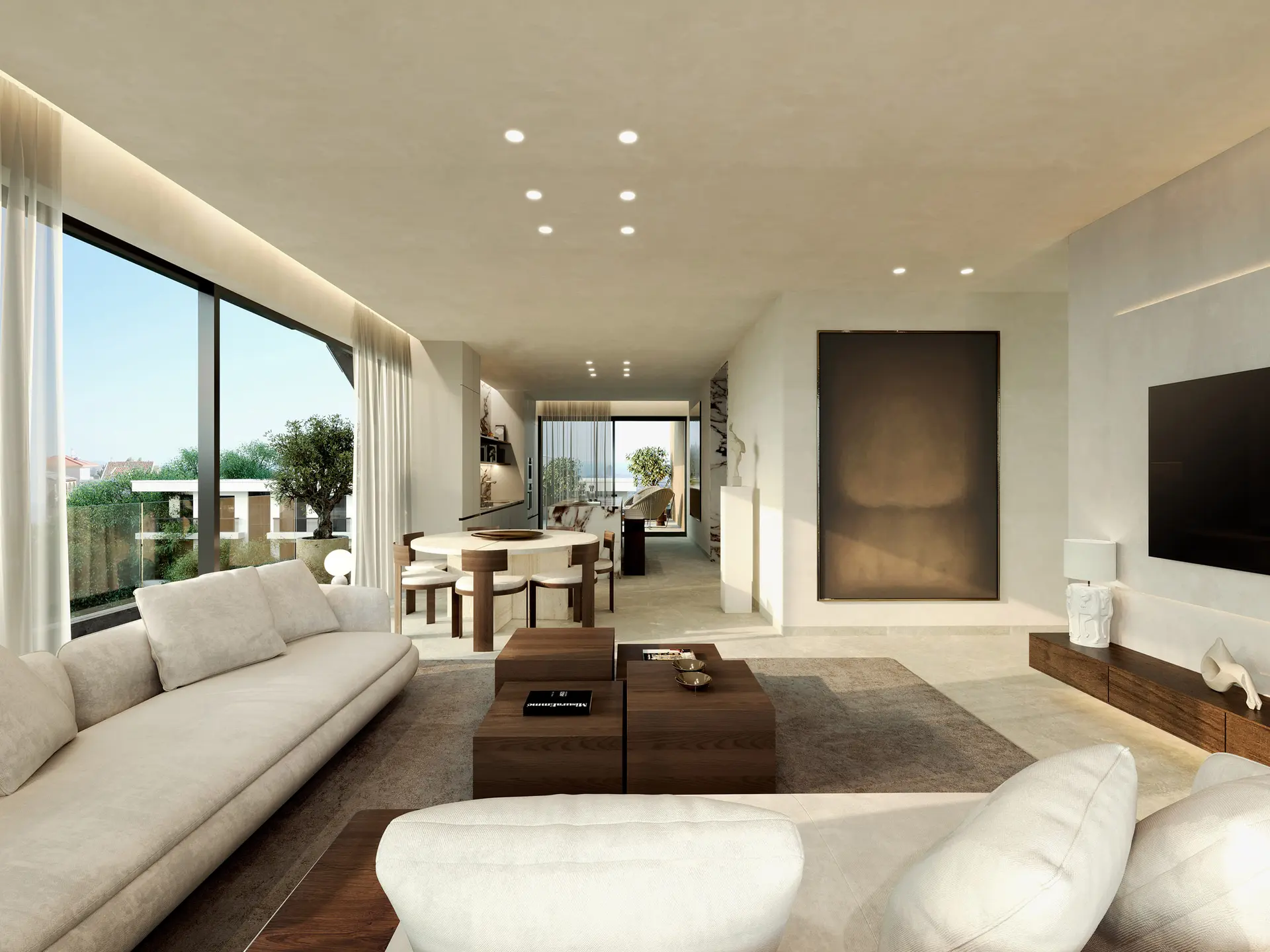 The apartment includes two generously sized bedrooms, including a master bedroom with en-suite bathroom, as well as an additional main bathroom. Thoughtful design ensures privacy between living and sleeping areas.